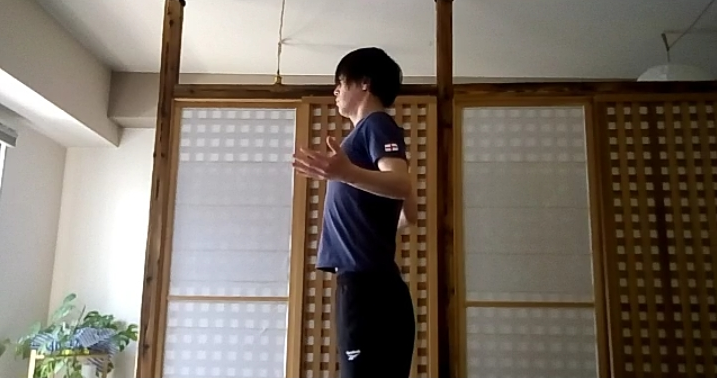 気をつけの状態から手の平を外側へ向けるだけで肩甲骨が少し内側へ動くのを感じます。